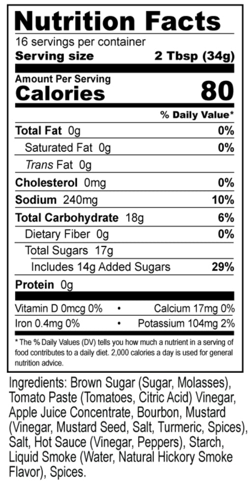 Brown Sugar, Tomato Paste, Vinegar, Apple Juice Concentrate, Bourbon, Mustard, Salt, Hot Sauce, Starch, Liquid Smoke, Spices