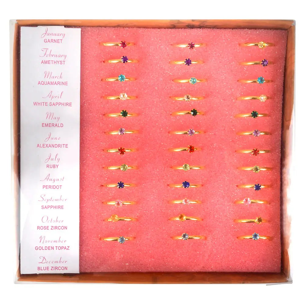 Birthstone inspired rings • Assorted styles • Includes a display stand to showcase rings • 3 dozen sold in a display box • Ages 6+