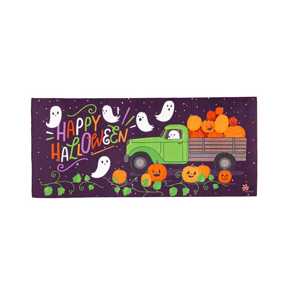 This Boo Truck Sassafras Switch Mat features a ghost driving a green pickup filled with jack-o-lanterns while his ghostly friends surround a "Happy Halloween" message.
