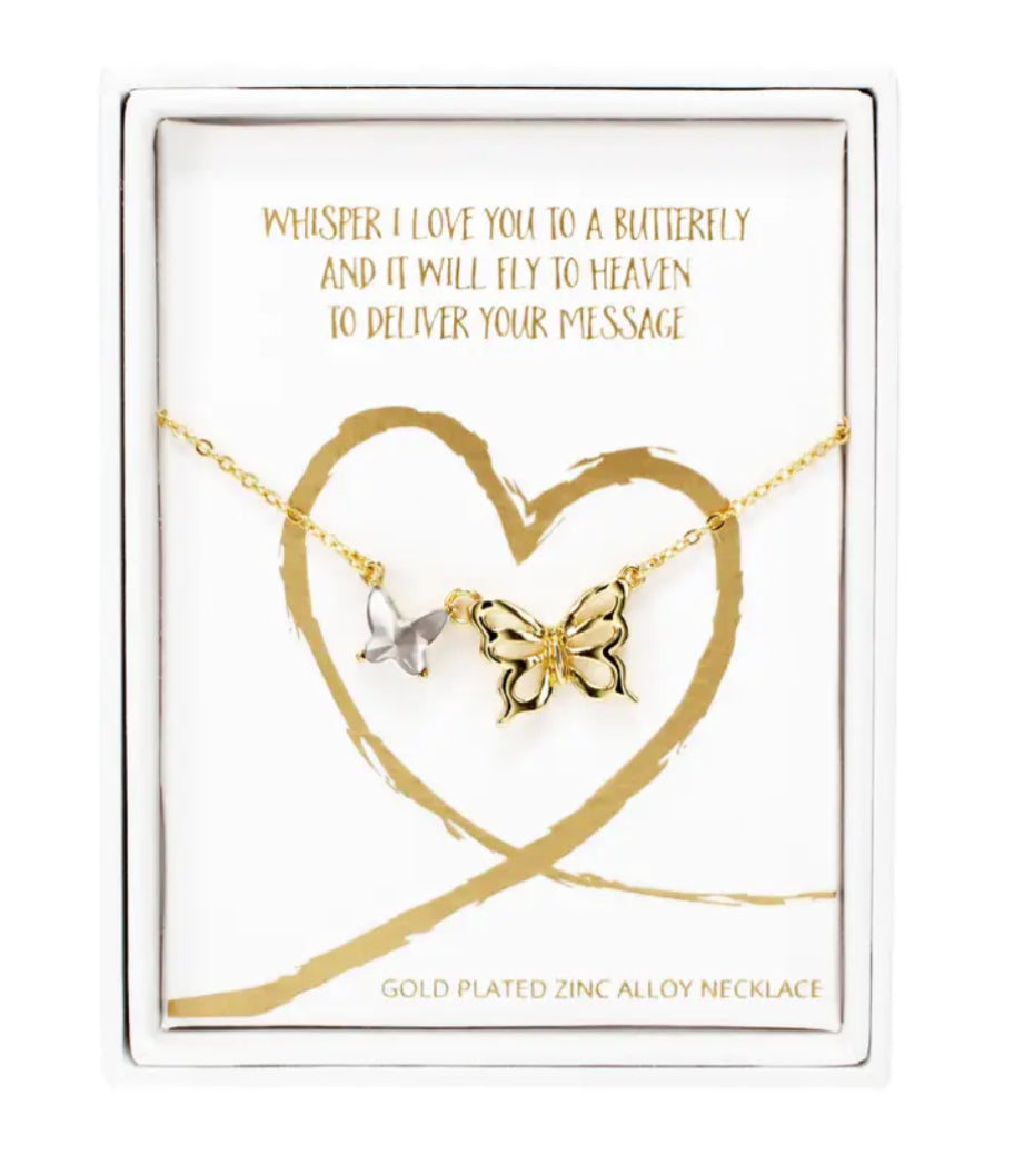 Adjustable necklace (16"-18") with a butterfly pendant, packaged in a printed box, is made from brass with an 18K gold plating and Swarovski element. "Whisper I Love You To A Butterfly And It Will Fly To Heaven To Deliver Your Message" text is printed onto the packaging. Wipe clean with a damp cloth, if necessary. Hypoallergenic, free of lead and nickel. Great for remembering a loved one who has passed.