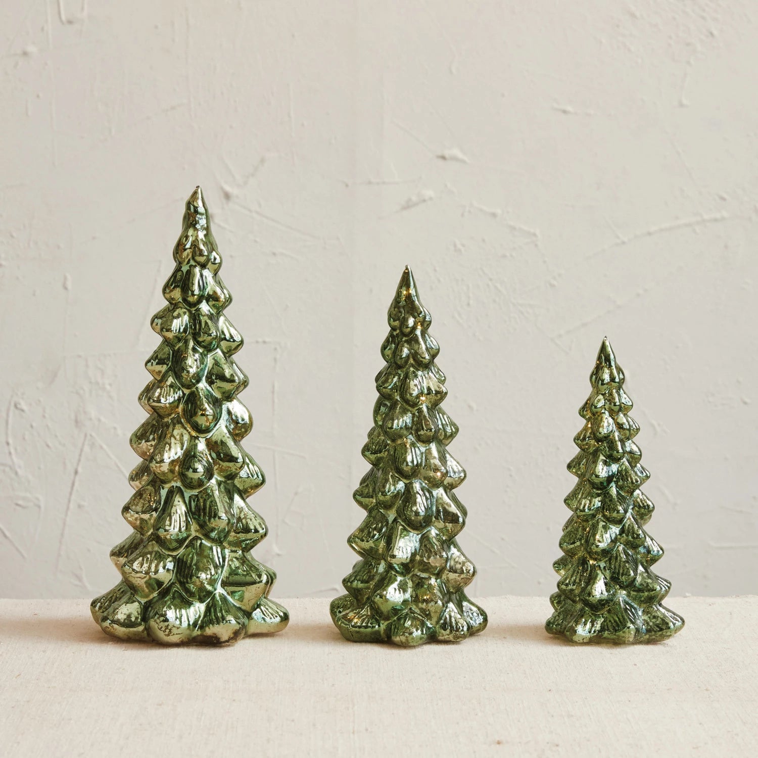 : 5-1/4" Round x 12-1/4"H, 4-1/4" Round x 9-3/4"H & 3-3/4" Round x 7-3/4"H Mercury Glass Trees w/ LED Light, Green