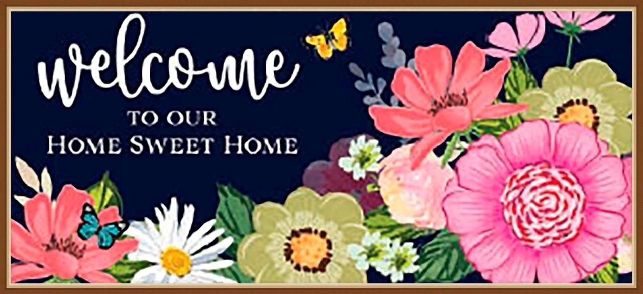 Bring a Charming Finish to any Home with this Mat called ✧ WELCOME TO OUR HOME SWEET HOME ✧ it features a Design with a Bright Bold Flowers on a Deep Black Background that makes them Pop, it reads: ' WELCOME TO OUR HOME SWEET HOME ' in White Letters, it is the Perfect Mat to Greet Friends & Family at the Door, Perfect for Ushering in Spring and Summer, and Absolutely Perfect for Everyday
