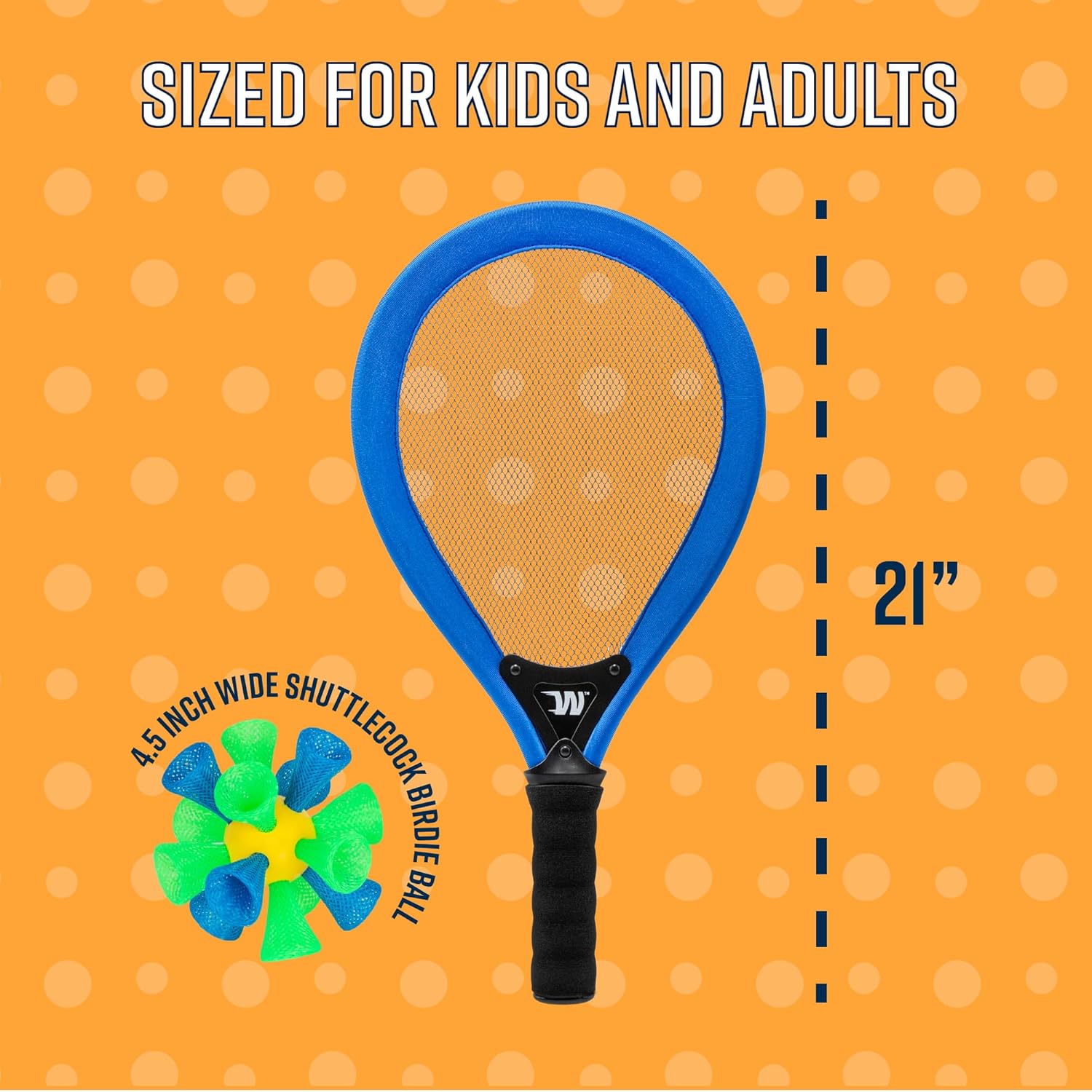 - A FULL SET: The Whackminton racket ball game comes with two blue mesh paddles, and one multicolored shuttlecock birdie ball. With its versatile gameplay, you can play it on the lawn, at the beach, or even on a camping trip making it perfect for every season & event!
